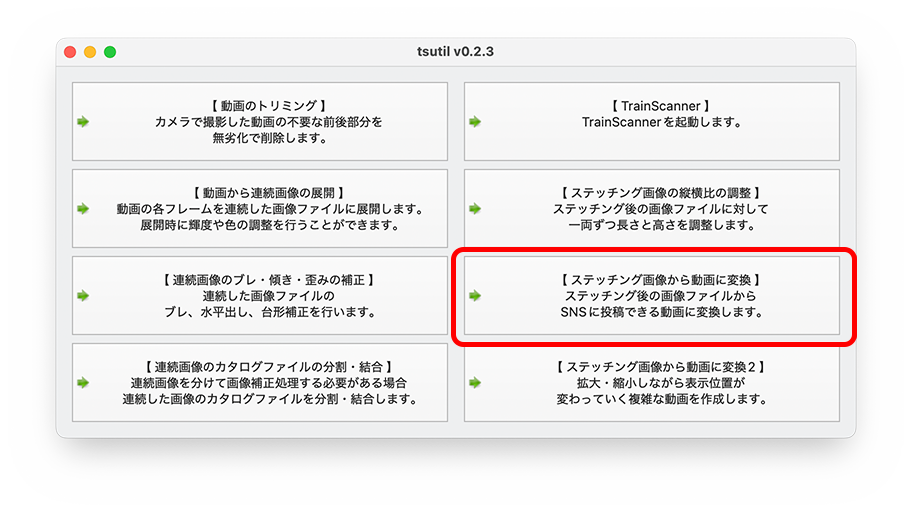 tsutilのメイン画面(メニューボタン)から「ステッチング画像から動画に変換」を選択して動画への変換ツールを開き、「Browse」(ファイルの選択)ボタンを押して編成写真のファイルを選択します。