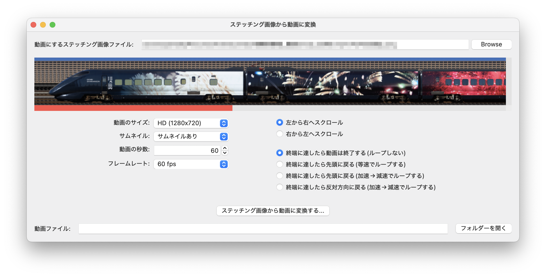 編成写真が読み込まれたら、生成する動画の条件を設定し、「ステッチング画像から動画に変換する…」ボタンを押して動画ファイルを保存します。
