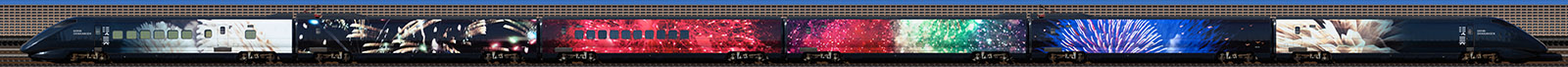 例えば、現美新幹線(E3系R19編成、2016年4月〜2020年12月運行)の編成写真はこんな感じで撮り残すことができましたが、オリジナル写真のサイズは39,958 x 1,700ピクセルです。下の写真はブログページに収まるように縮小して1,600 x 68ピクセルにしています。