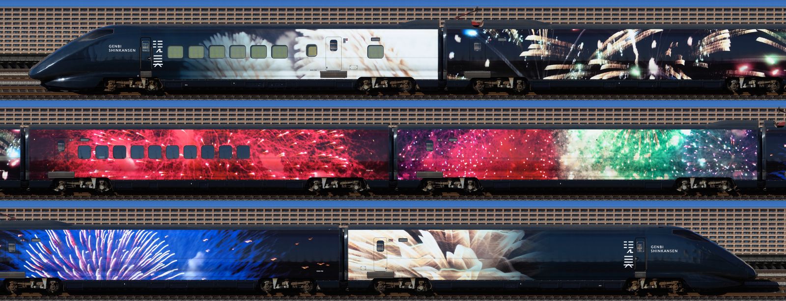 オリジナルの編成写真は高精細で車体の文字もはっきり読めるのですが、上の写真では文字どころか台車やパンタグラフさえも見るのが難しいと思います。X(Twitter)でシェアできる写真サイズも最大で4Kピクセル程度です。3等分して3段にすれば解像度は3倍にできますが、先頭車両のGENBI SHINKANSENの文字がギリギリ読める程度です。