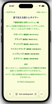 音で伝える筋トレタイマー。Webブラウザで動きます。音でタイミングや時間が把握できます。ボリュームを上げてお使いください。