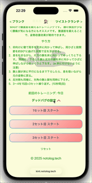 設定内容はブラウザの中に記憶するので、次回も同じ設定で筋トレを実施できます。ついでに前回のトレーニング日も記憶しています。これによって毎日筋トレを続けるためのモチベーションに期待できます。