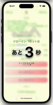 バージョンアップした筋トレタイマーでは、1セット終了するたびにインターバル時間をカウントダウンする機能を追加しました。インターバルが終了すると次のセットのスタートボタンが自動的に作動するようになっています。