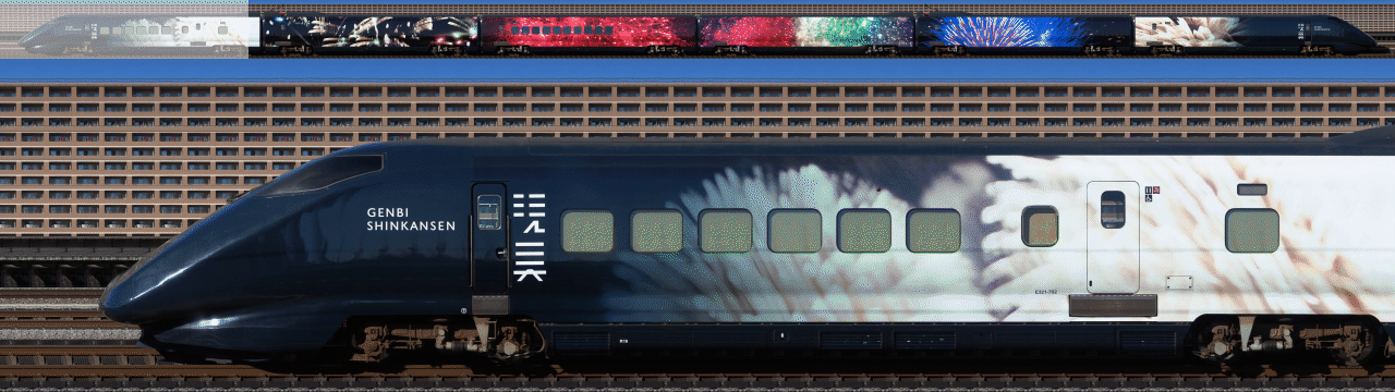 # GIFとして保存quantized_frames[0].save( "out.gif", save_all=True, append_images=quantized_frames[1:], loop=0, duration=100, # 各フレーム100ms optimize=False, disposal=2, # 前のフレームを消去して次を描画(透過扱い))以下は全フレームで共通パレットを使って生成したアニメーションGIFの例です。1両ごとに様々な色でラッピングされた現美新幹線ですが、このアニメーションGIFに色のチラつきは起きていないと思います。