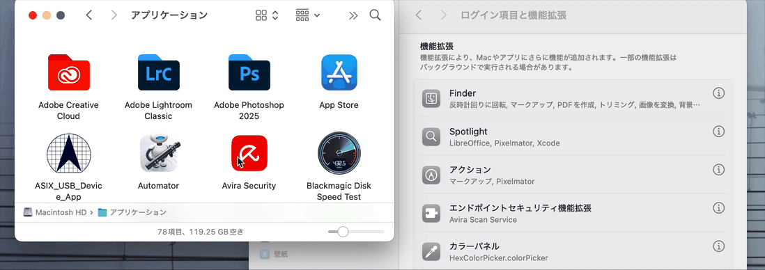 ログイン項目と機能拡張のバックグラウンドでの実行を許可にもAvira Securityが表示されていましたが、一度一般の画面に戻って再びログイン項目と機能拡張を開くと、Avira Securityは消えていました。