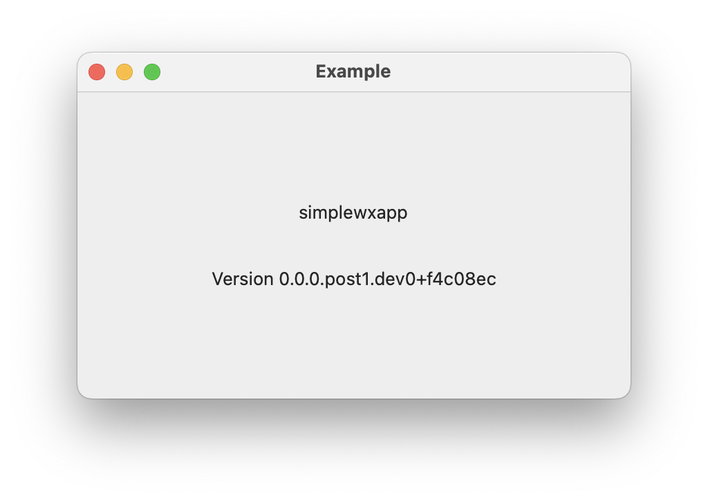 def main() -> None: app = wx.App() main_frame = MainFrame(None, title='Example') main_frame.Show() app.MainLoop()以下のコマンドを実行すると、wxPythonのウィンドウが開いて、Pythonパッケージ名とバージョン番号を表示します。