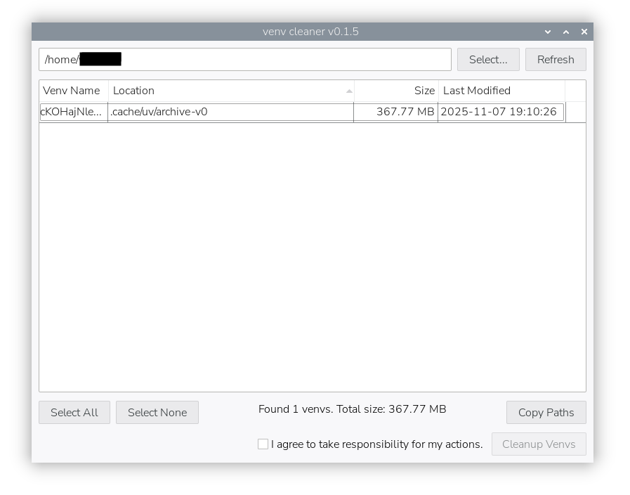 # PATH環境変数からpyenvへのパスを削除した状態で、以下のコマンドを実行 (Xubuntu 24.04)uv cache cleanuv venvcleanerちなみに、MacやWindowsではuvxで簡単に動きます。uvx venvcleanerと入力するだけで、ツールと一緒にビルド済みのwxPythonがダウンロードされます。