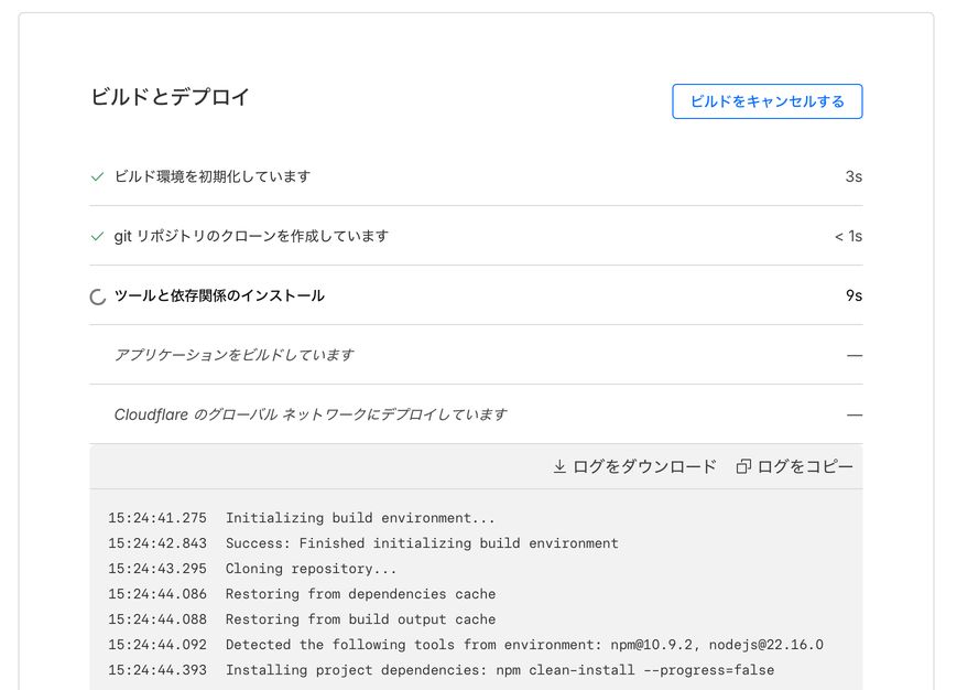 この後さらにソースコードを修正してcommit・pushすると、Cloudflareで自動的にビルドが動いて、新しいバージョンのアプリが自動的にデプロイされます。