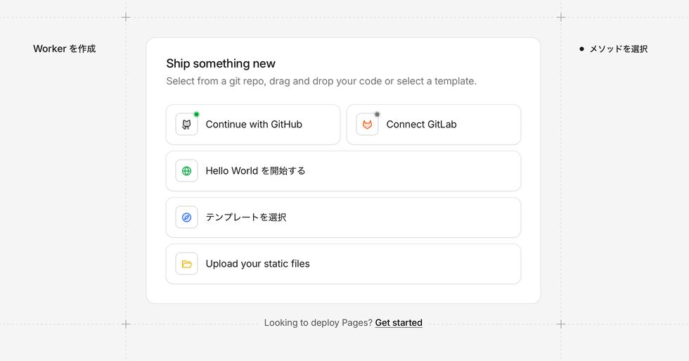 話は逸れますが、C3を使ってPagesプロジェクトを作成した場合、下にあるGet startedをクリックしてアプリケーションの作成作業を進めることができます。