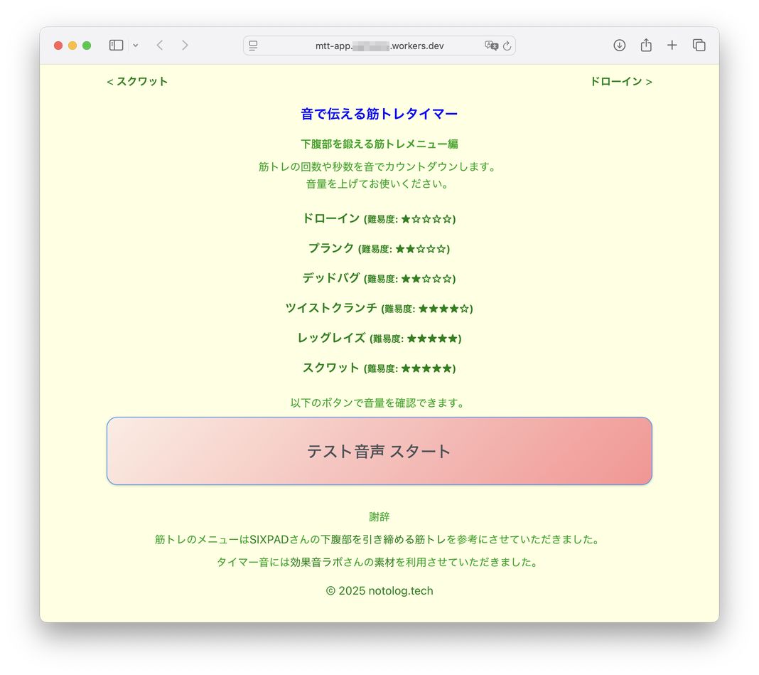 訪問するボタンをクリックすると、筋トレタイマーが無事起動できました!