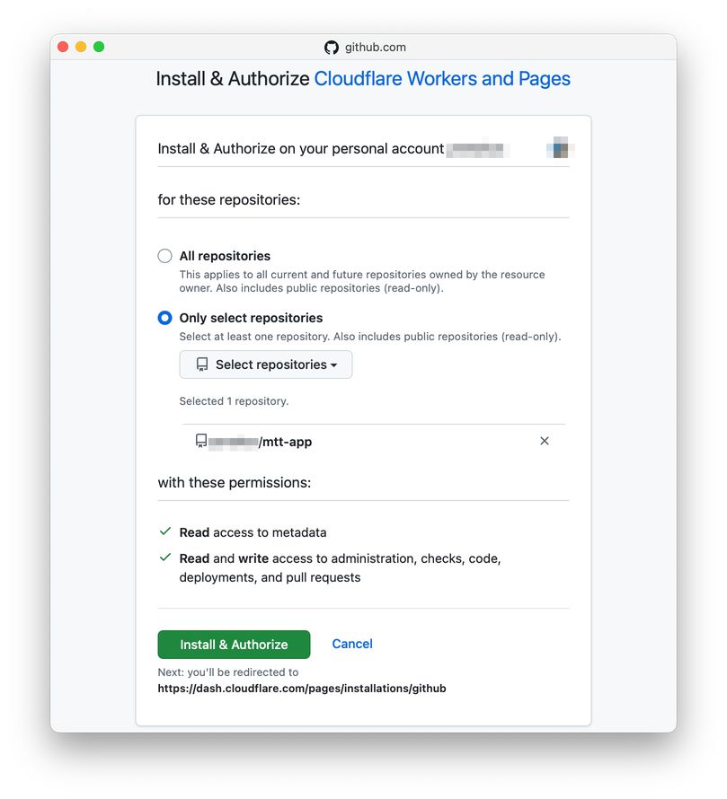 初めてContinue with GitHubをクリックした場合、Install & Authorize Cloudflare Workers and Pagesという画面が表示されます。これはCloudflareではなくGitHub.comの画面であり、GitHubアカウントのSettings→Applicationsの画面で設定を変更・削除できます。
