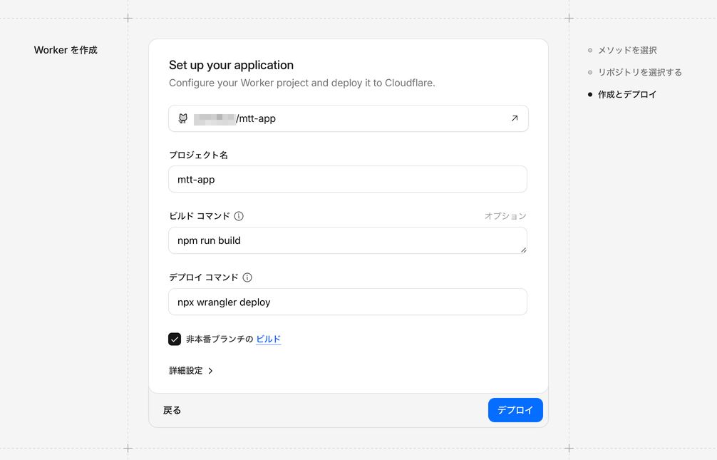 まずは、CLIのC3(create-cloudflare-cli)を使ってWorker用のプロジェクトを作ります。プロジェクトの名前はmtt-appとします。
