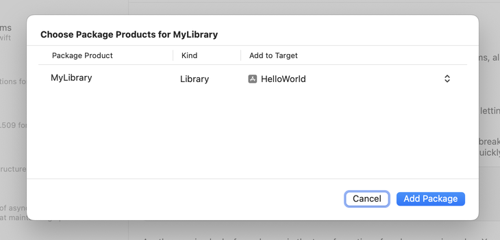 import宣言するとNo such moduleエラーになるので、File -> Add Package Dependencies… でパネルを開き、Add Local… ボタンを押してモジュールのフォルダを選択して、Add Package ボタンで依存関係に追加する。