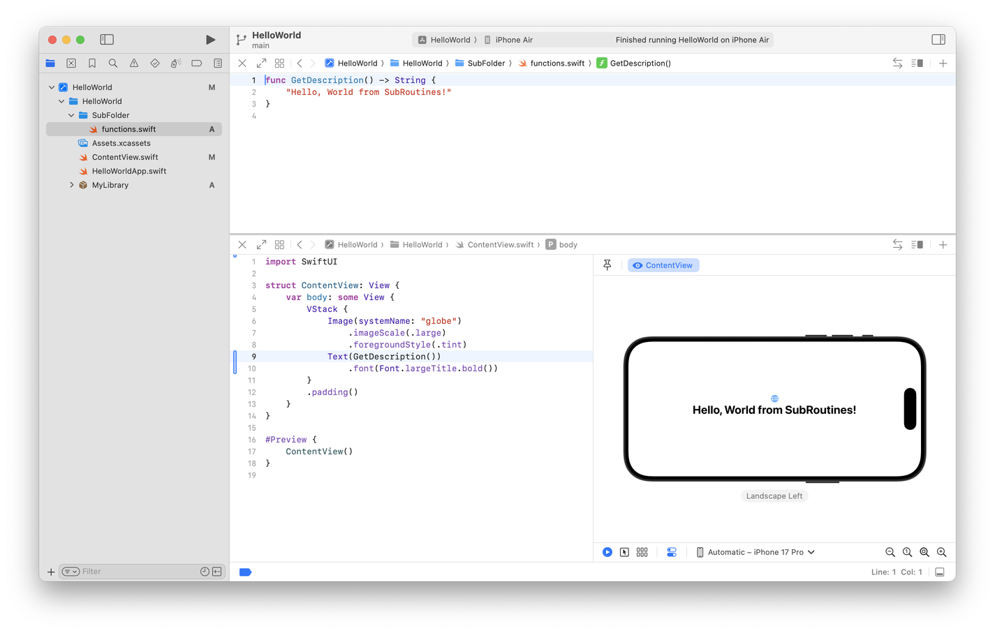試しに、XcodeでHello, world!を表示するだけのアプリを新規作成して@ViewBuilderを使わずにSwiftの構文で書き直してみました。