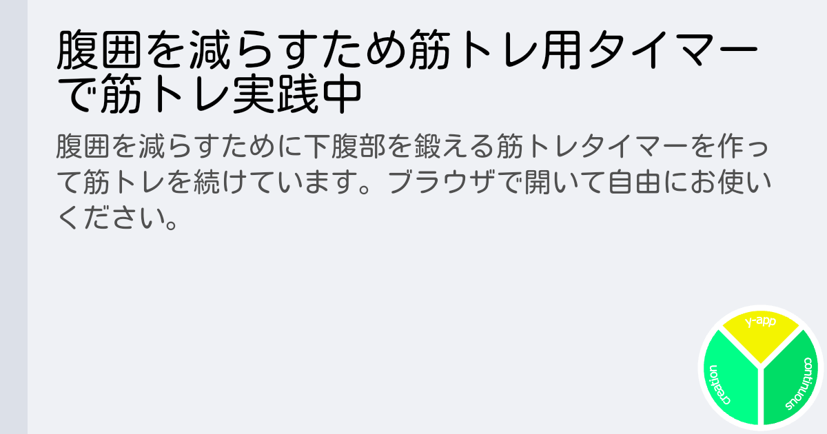 Section titled “お手軽な筋トレで毎日続けられるように”X(Twitter)で #筋トレ好きと繋がりたい というハッシュタグがありますが、ものすごい筋肉の写真のポストが大量に出てきて驚きます。音で伝える筋トレタイマーのメニューではそこまで筋肉を鍛え上げることはできないかもしれません😅