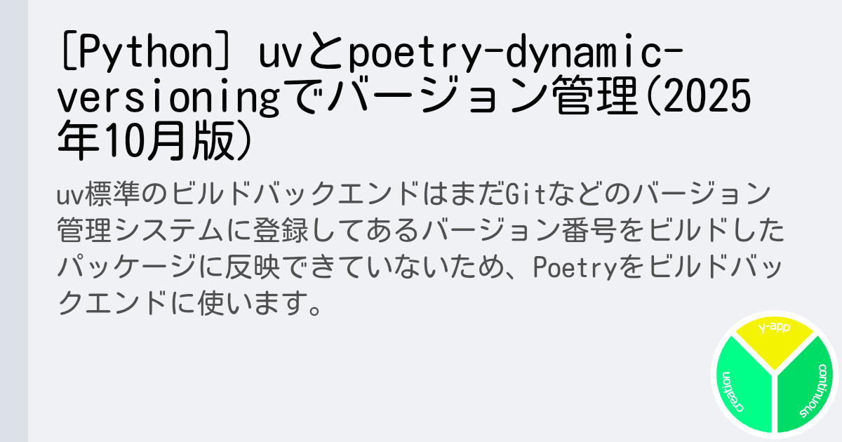# プロジェクトをパッケージ化uv build2025年10月14日時点での最新版0.9.2では、デフォルトのビルドバックエンドはuv_buildですが、私は以下の理由でPoetryをビルドバックエンドに使っています。