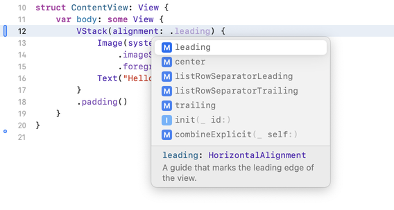 Section titled “型推論による省略” VStack(alignment: .leading) { /* 中略 */}ドット(.)から始まる識別子はVisual BasicのWithステートメントによる構文で見たことがありますが、Swiftではドットの前に置かれるはずの型名や変数名などの識別子がソースコードのどこにも見当たらないので困惑しました。